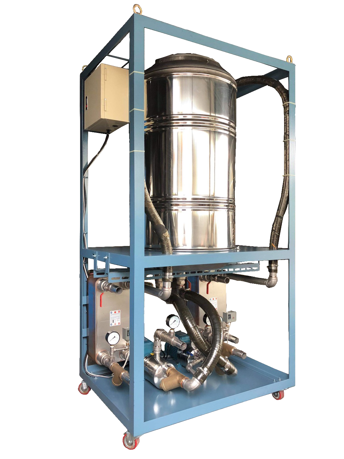 此裝置主要進行對直流櫃、 高頻主機櫃等發熱部份冷卻;採用水熱交換器形式, 內循環水用工業用蒸餾水。